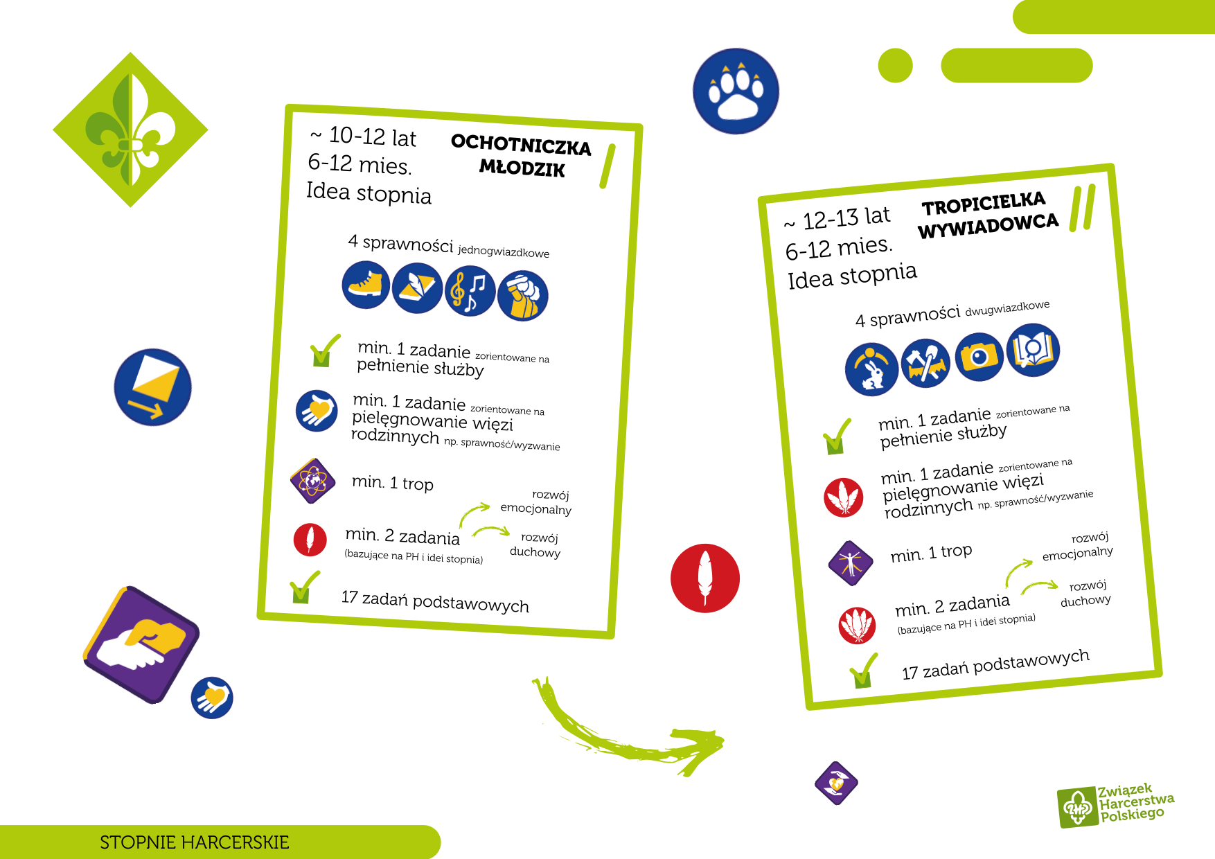 Po drugie, w próbach od ochotniczki/młodzika do samarytanki/ćwika wskazane jest także ile minimum sprawności należy zdobyć podczas realizacji próby. Mogą być to oczywiście sprawności wynikające z zadań na stopień lub zupełnie inne, związane z zainteresowaniami harcerza lub harcerki.